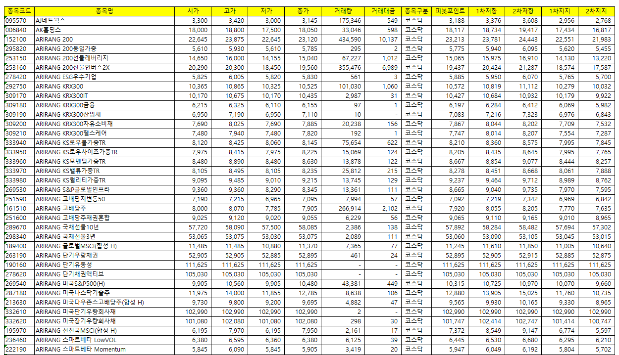 종목코드 종목명 시가 고가 저가 종가 거래량 거래대금 종목구분 피봇포인트 1차저항 2차저항 1차지지 2차지지